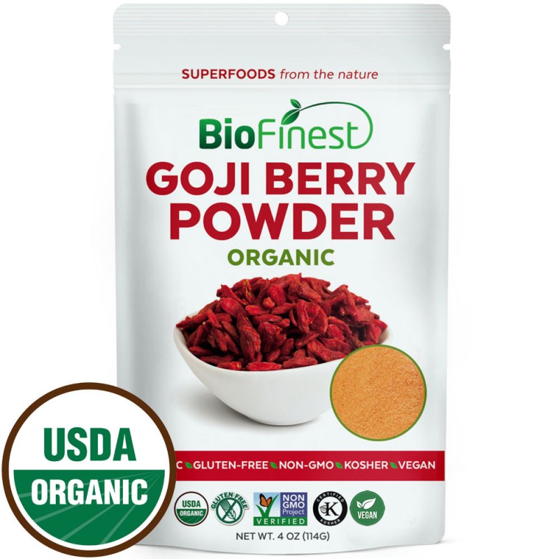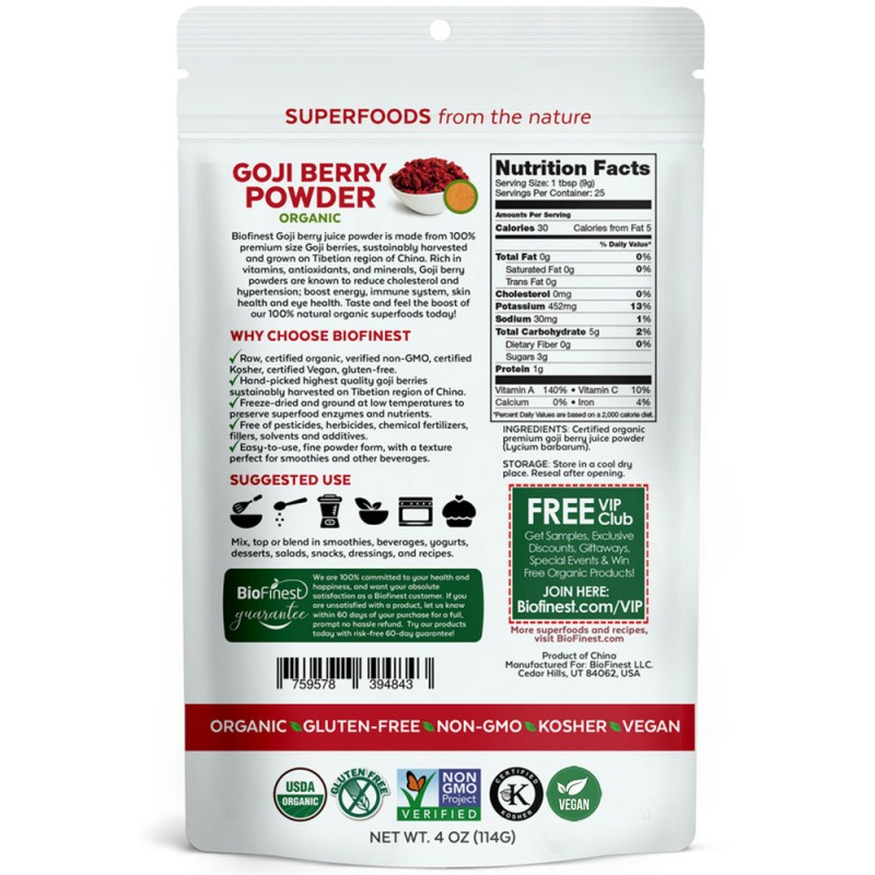 Thành phần: 100% bột quả kỷ tử (goji berry) hữu cơ chất lượng hảo hạng, được trồng và thu hoạch ở vùng Tây Tạng của Trung Quốc.